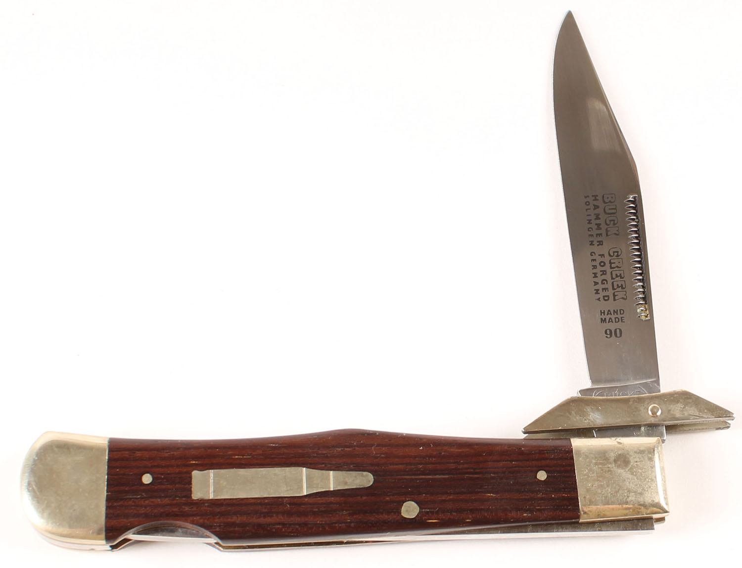 Buck Creek knife, 3'' folding blade, wood handle, solid and clean. Grade: Excellent - Value: 10 to 50