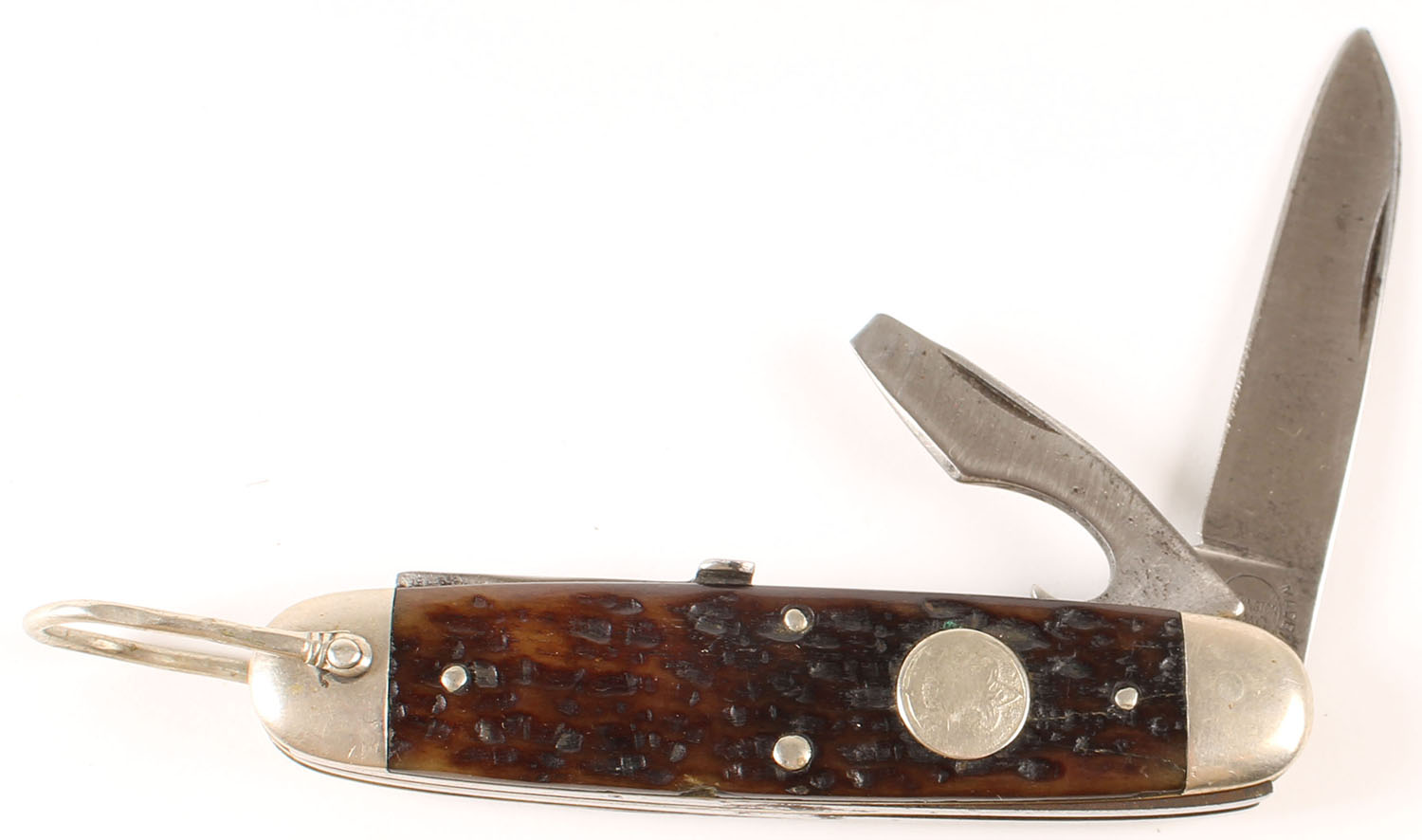 Remington UMC Boy scout knife, multi blade folding knife, celliod handle, some age soiling. Grade: Excellent - Value: 20 to 80