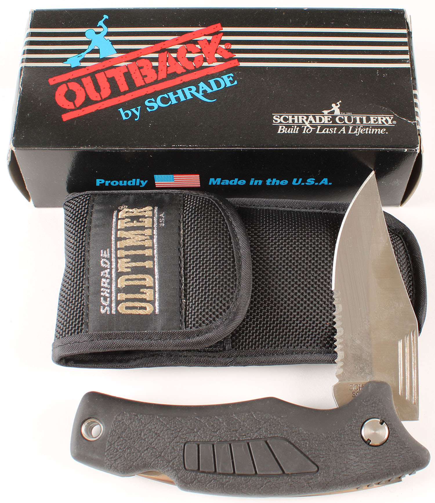 Schrade Outback knife, folding 3 1/2'' blade knife, in box and sheath. Grade: Excellent ++ - Value: 16 to 40