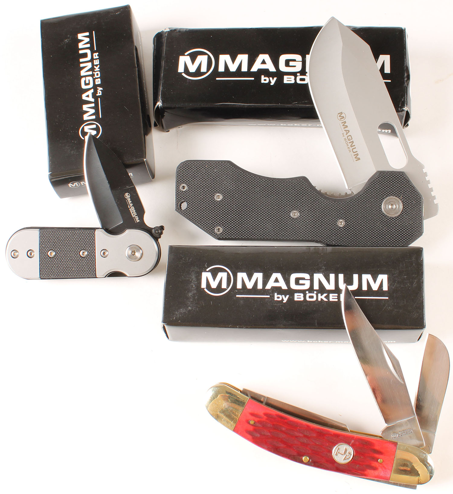 Lot of 3 Magnum Boker folding knives, in box. Grade: MINT - Value: 20 to 60