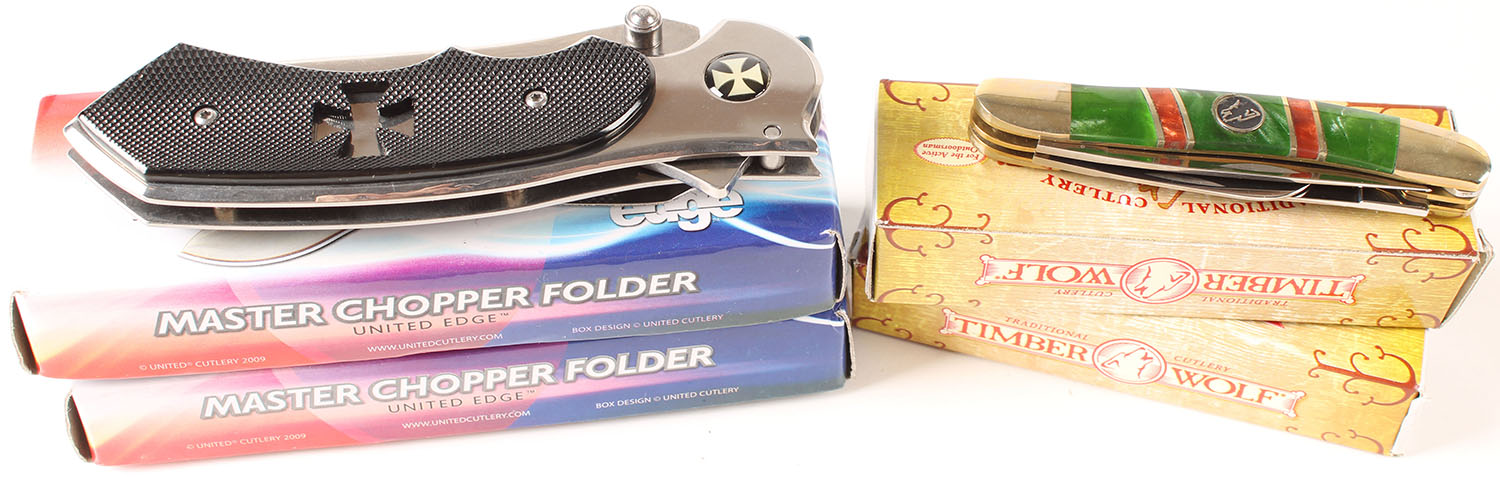Lot of 4, Timber Wolf and Master Chopper Folder knives, in box. Grade: MINT - Value: 16 to 60