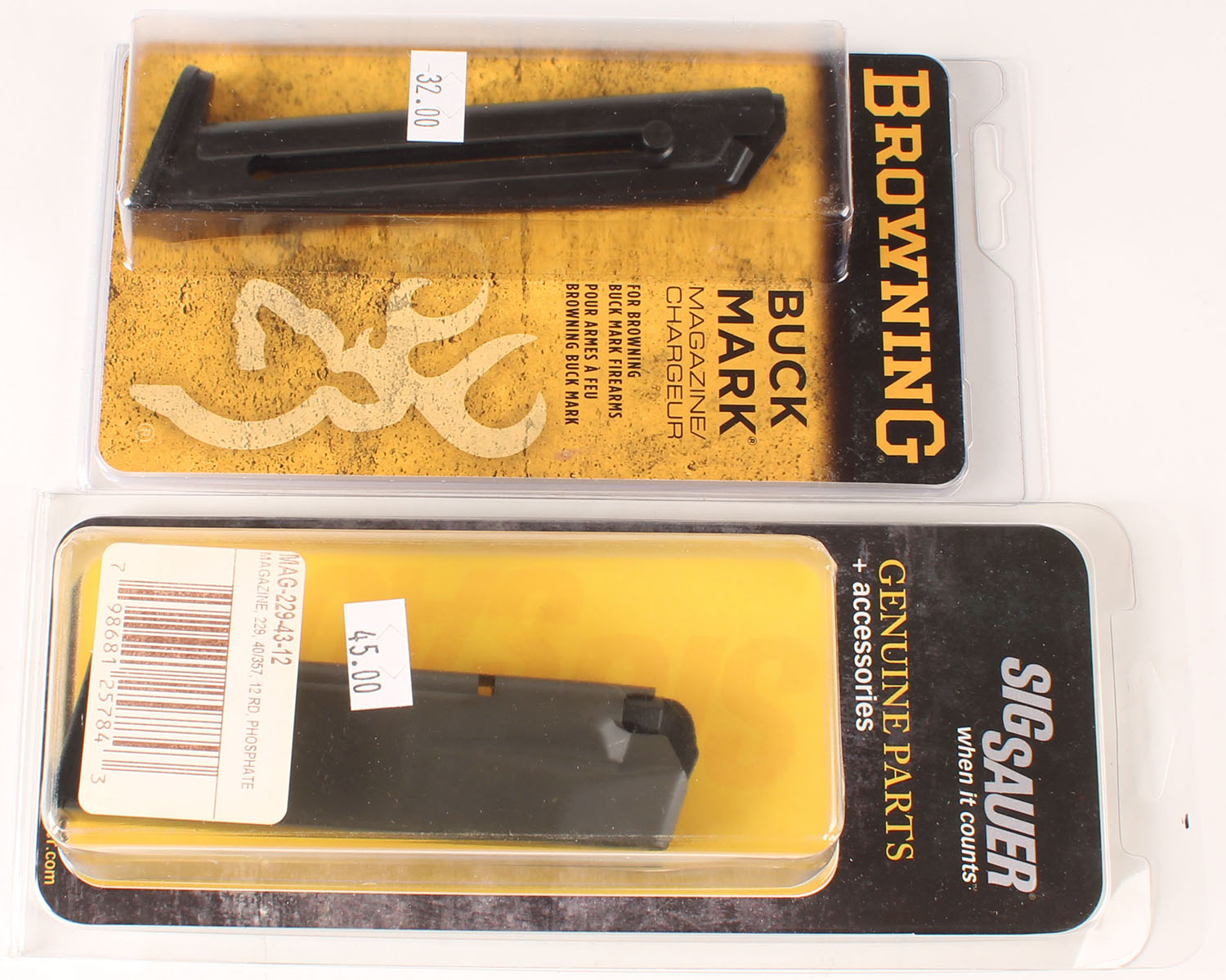 Lot of 2 pistol mags., .223 cal and 40/357 cal mags., in its original packaging. Grade: Excellent ++ - Value: 16 to 50
