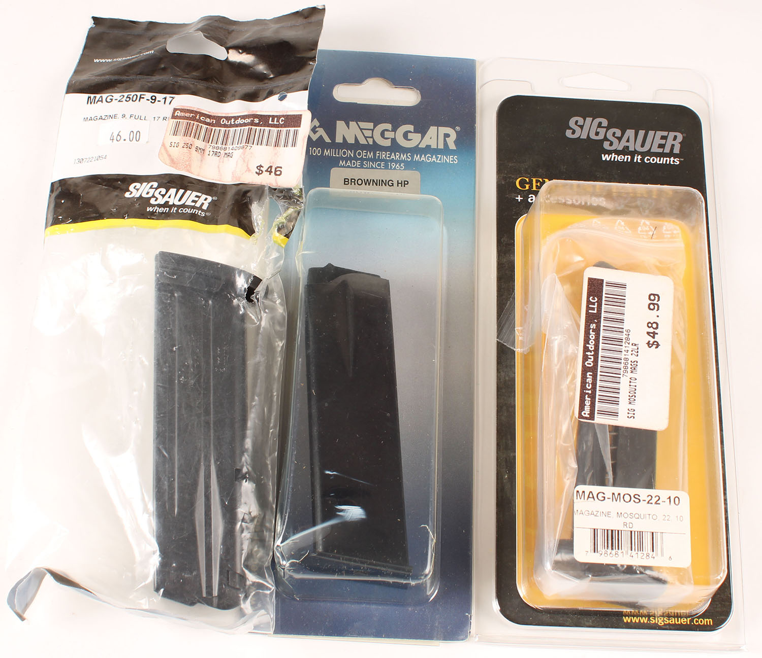 Lot of 3 mags, two Sig sauer 9mm and 22 LR and a Meggar Browning HP 9mm. Grade: Excellent - Value: 40 to 100