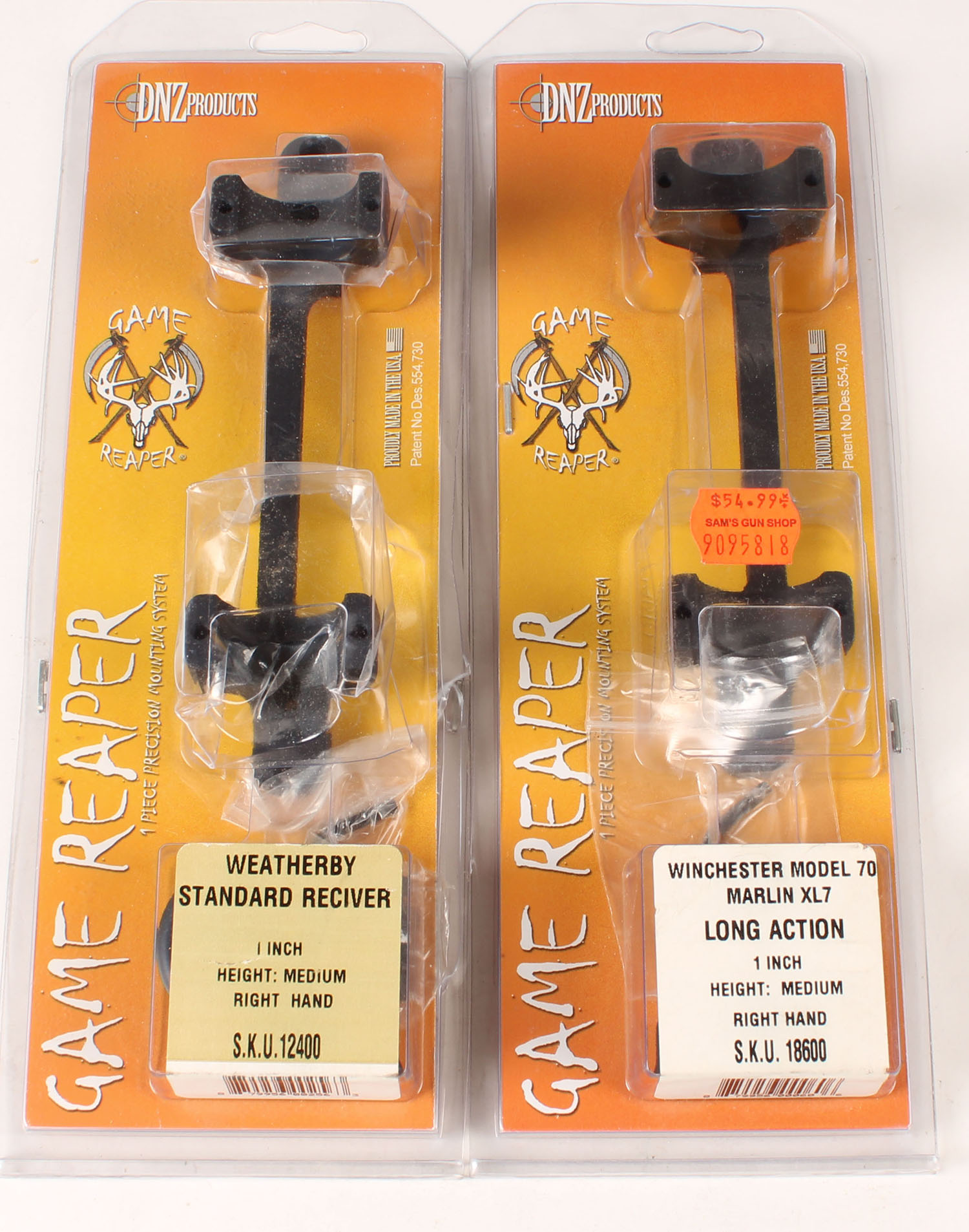 Lot of 2 Game Reaper mounts, Weatherby standard receiver and Win model 70, in orignal packaging. Grade: Excellent - Value: 40 to 80