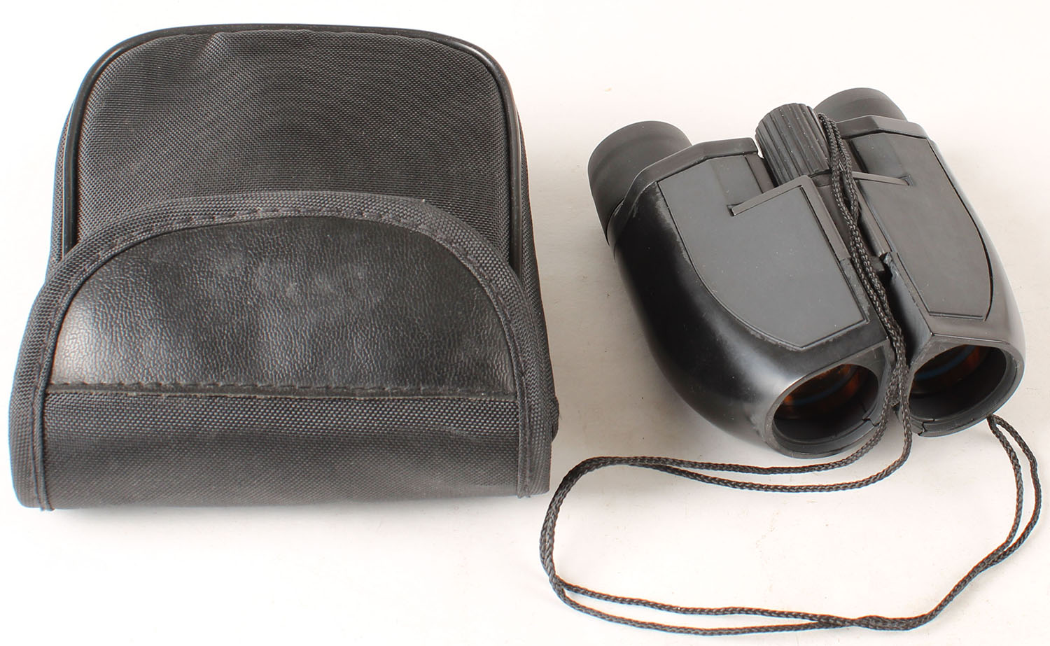 Unmarked binoculars, with soft case, Crack to front. Grade: Very Good - Value: 2 to 40