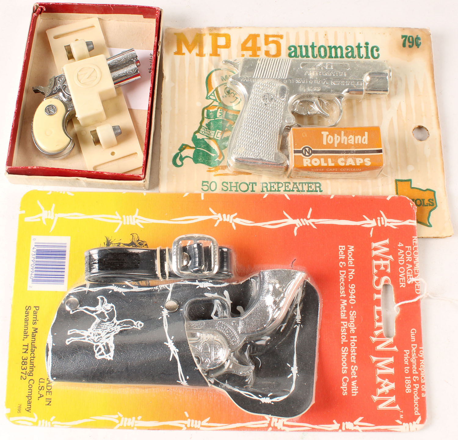 Lot of 3 Vintage Cap pistols, marked Dyna-MITE, Western Man, MP45 Nichols. Grade: Very Good - Value: 10 to 50