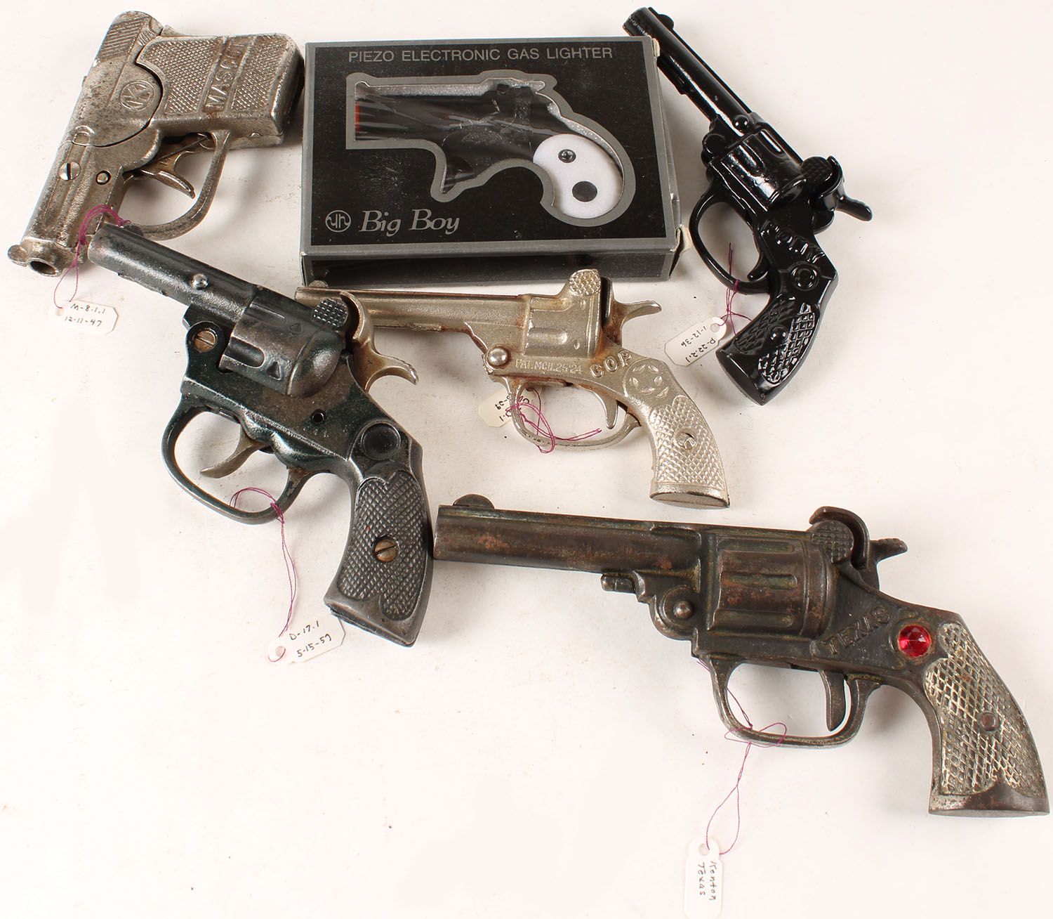 Lot of 6 Vintage Cap pistols, marked K Mascot, Dixie Jr, Texas, COP, Pony, Piezo Elec, gas lighter Big Boy in box. Grade: Very Good - Value: 10 to 100