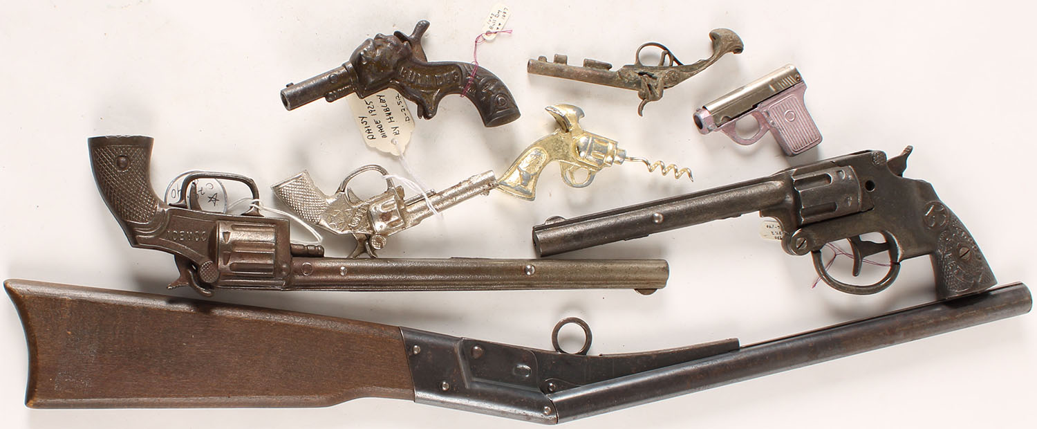 Lot of 8 Vintage Cap/cork pistols, marked King Pop No 16 cork rifle, Stevens Cowboy, Kilgore Trooper Safety, Hubley Daisy, Bulldog, Cork Screw for wine, (2) unmarked. Grade: Very Good - Value: 10 to 150