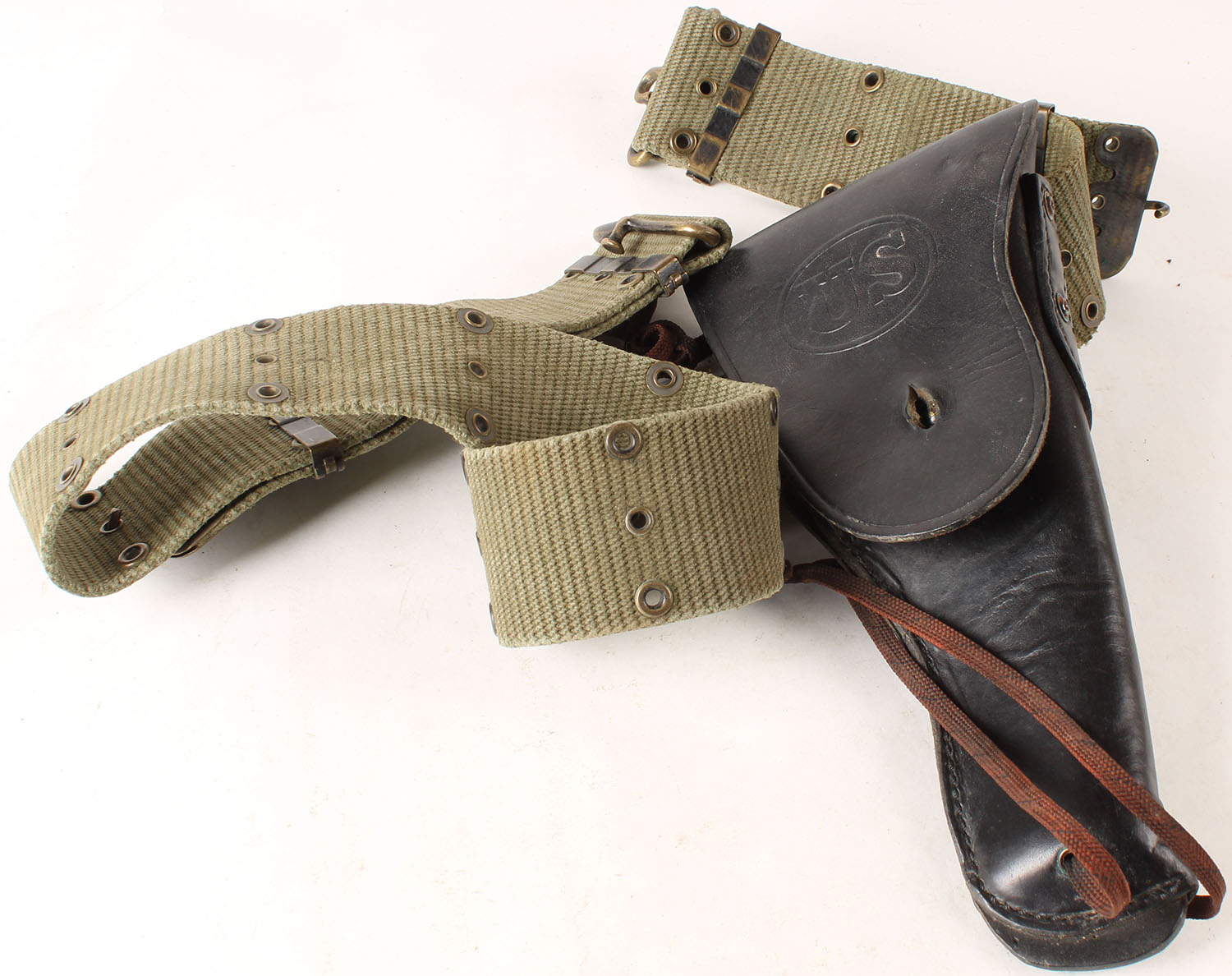 US 1911 leather holster by Hunter, has canvas belt. Grade: Very Good ++ - Value: 20 to 100