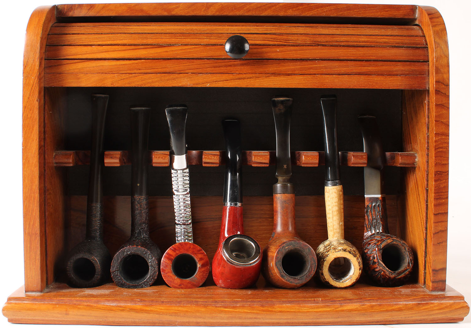 Tobacco Pipe storage case for your desk or counter, holds 7 pipes, this one has all 7 include, 13'' wide has sliding front door that goes up, Dr. Grabow Viking, Meerschaum Missouri Corn Cob, Savinelli 125 Italy, Karl Erik Denmark, Boni??? , (2) unmarked. Grade: Excellent - Value: 50 to 350