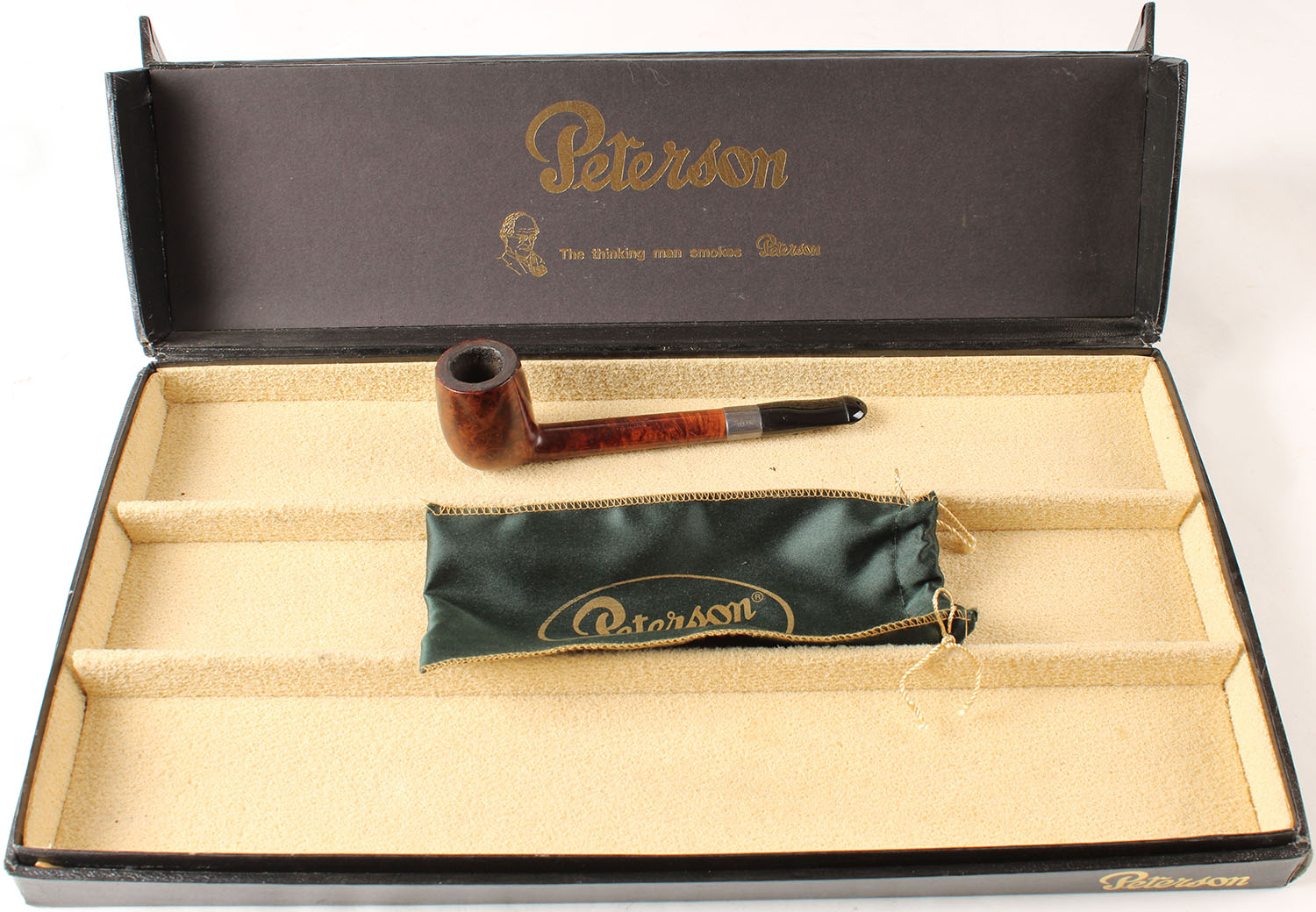 Peterson Tobacco pipe with original display case & cloth bag, 15 1/2'' wide. Grade: Excellent - Value: 50 to 300