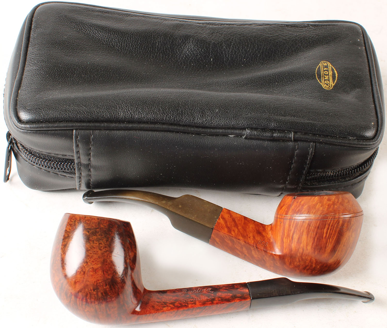 Lot of 2 Tobacco pipe in soft case marked Straight Grain London, Barling International. Grade: Excellent - Value: 10 to 60