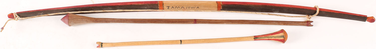 Small bow with two arrows, marked Tama Iowa, 23'' long. Grade: Excellent - Value: 4 to 40