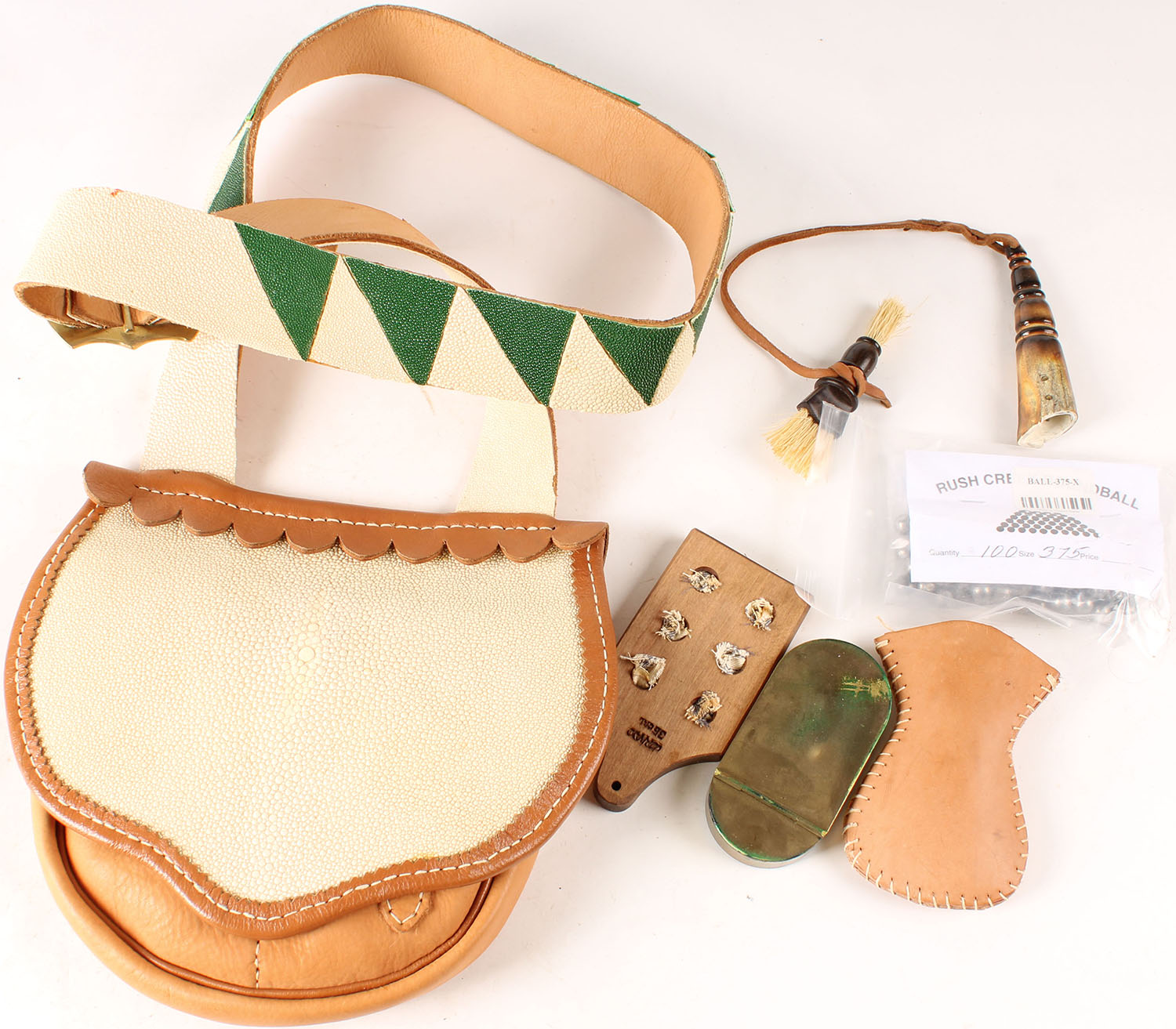 Black Powder reloading leather bag, full of every thing you need to load a black powder weapon, see photo for details. Grade: Excellent - Value: 20 to 100