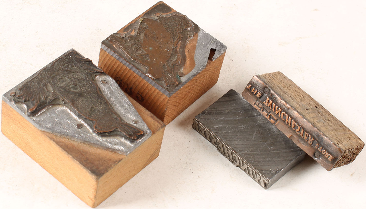 Lot of 4 Printing stamps on wood blocks, 2 Winchester a crow & a rabbit. Grade: Excellent - Value: 6 to 30