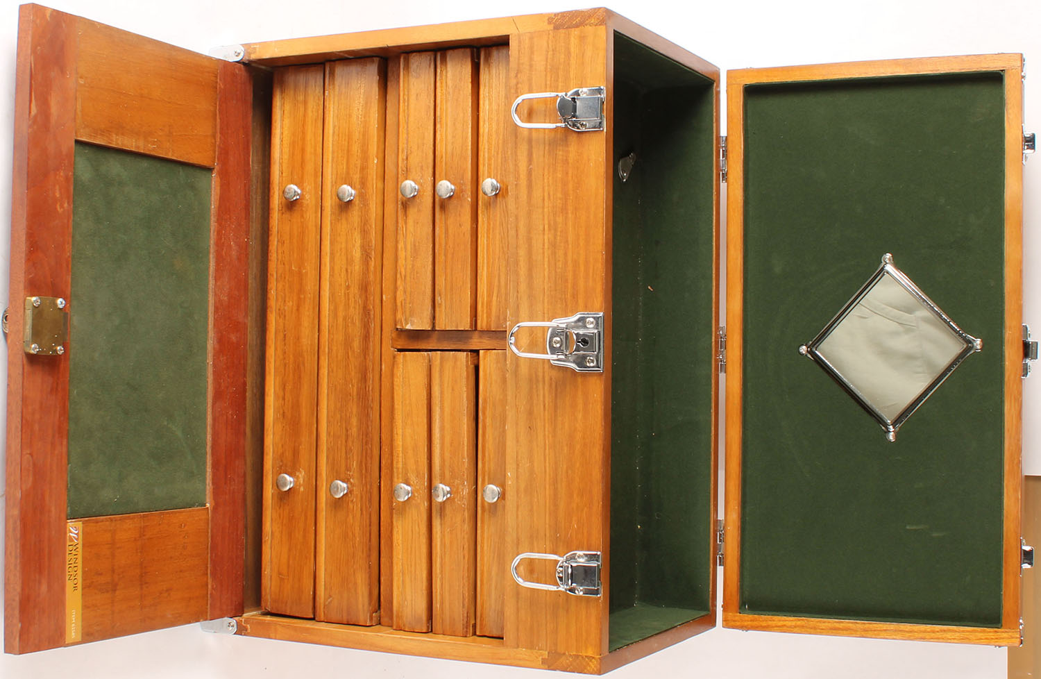 Wood Gun or parts cabinet, has lid on top with 9 drawers down low, 20'' wide & 10'' deep. Grade: Excellent - Value: 10 to 50