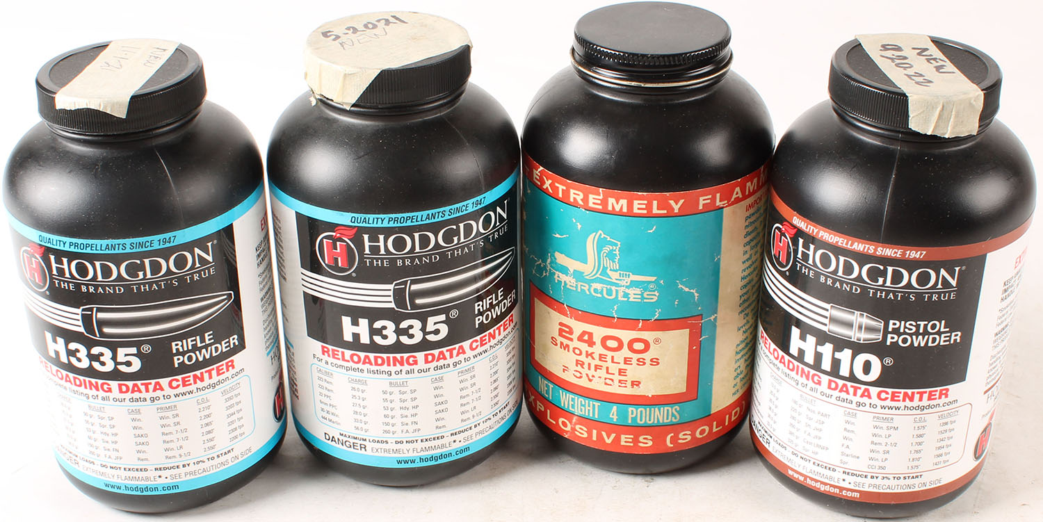 Hodgdon, Lot of (4) 1lb bottles of H335, H110 & 2400, Smokeless Powder, all bottles are full or mostly full. Grade: Excellent - Value: 20 to 100