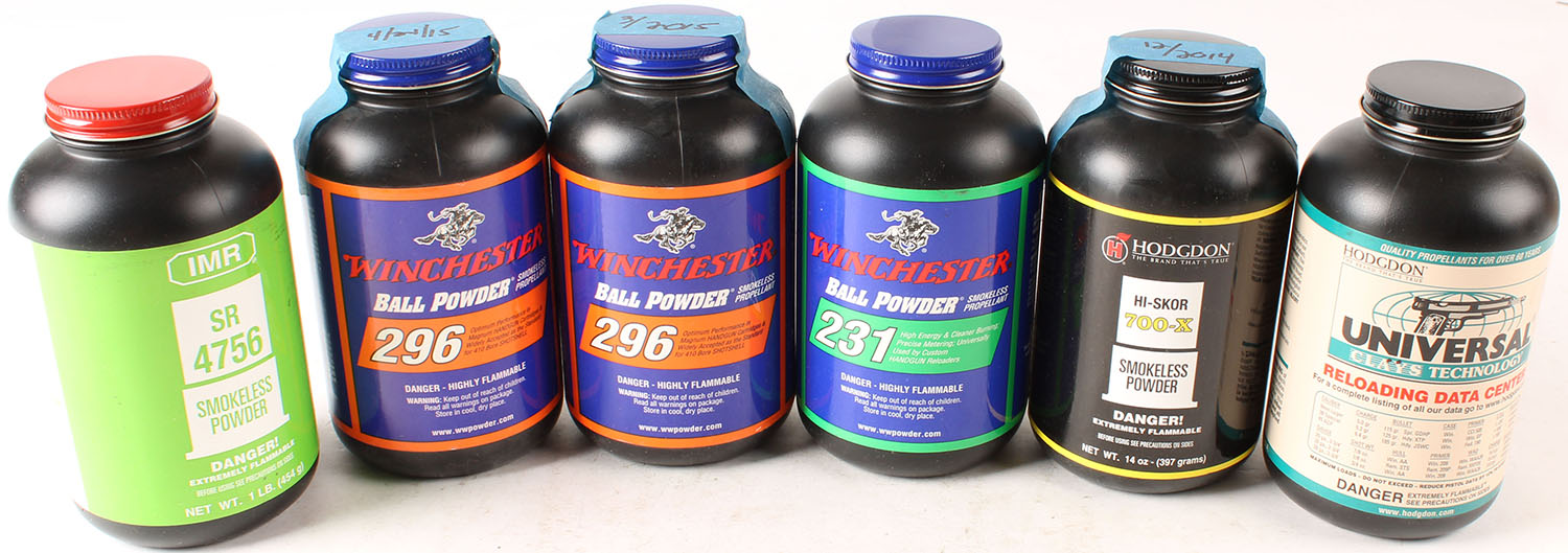 Mixed Mfg., lot of (6) 1lb bottles of various powder types, all bottles are full or mostly full. Grade: Excellent - Value: 30 to 150
